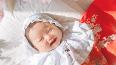 お宮参りスタジオ撮影のご紹介。桜に包まれた春らしい背景と祝い着で、赤ちゃんの自然な表情を丁寧に残します。初めての撮影も安心してご相談ください。